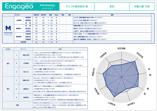 Engageoは会社の特性・個性を数字化して目に見える形にします。数字化するのは会社全体だけではなく、部署や拠点ごとにも集計します。